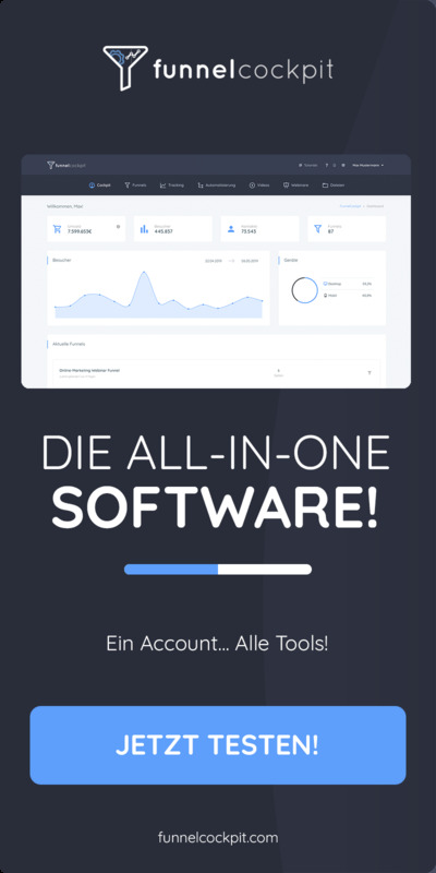 Es ist der perfekte Partner für alle, die hoch konvertierende Online-Marketing-Kampagnen erstellen wollen. Es ist das Schweizer Taschenmesser des digitalen Marketing - immer bereit, immer zuverlässig. Mit Funnelcockpit an deiner Seite steht deinem Erfolg nichts mehr im Weg!